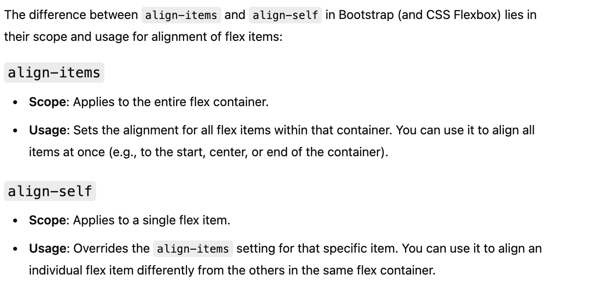 Quickly manage the layout, alignment, and sizing of grid columns, navigation, components, and more with a full suite of responsive flexbox utilities. For a more detailed explanation please refer to https://getbootstrap.com/docs/4.0/utilities/flex/
